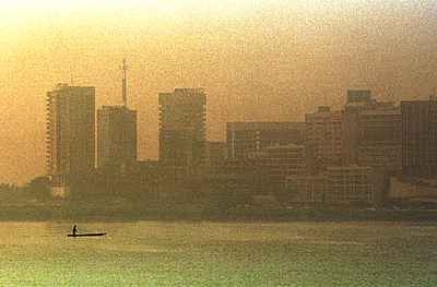 IC18: A lone fisherman in Abidjan's lagoon during Harmattan.