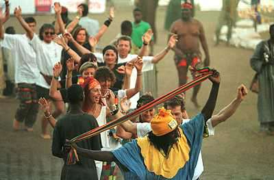 SN05: A "toubab" parade during intermission at a Senegalese wrestling match.