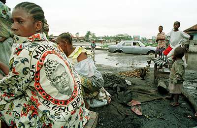 CZ25: A charcoal vendor wears Mobutu cloth alongside a flooded Kinshasa street.