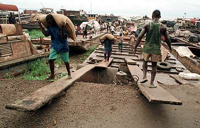 CZ35: At Kinshasa's main river port, sacks of cocoa arriving from Kisangani are carried to shore.
