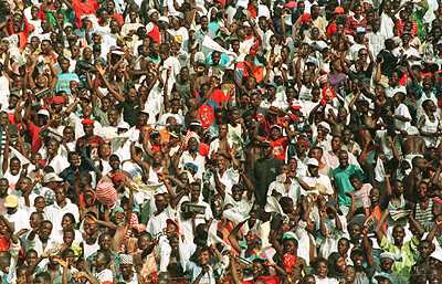 LB16: Fans celebrate at the Monrovia stadium after a goal by the national team.