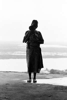 LB22: A woman holds her baby near the top of the remains of a Monrovia high-rise.
