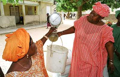 SN26: A woman measures grain to be distributed in a village in northern Senegal.