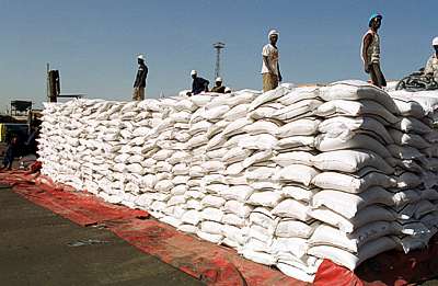 SN45: Bags of rice are unloaded from a ship in the port of Dakar, Senegal.