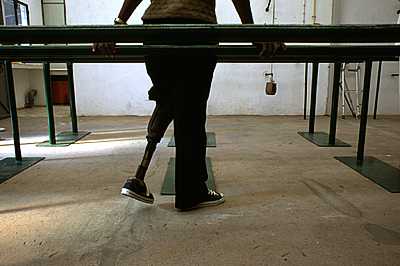 AN09: A landmine victim learns to walk with a prosthetic limb in a clinic in Kuito, Angola.