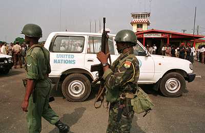 LB02: Ecomog soldiers in Liberia and a UN 4x4.