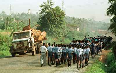 GH02: School children march alongside a truck carrying recently cut forest near Tarkwa, Ghana.