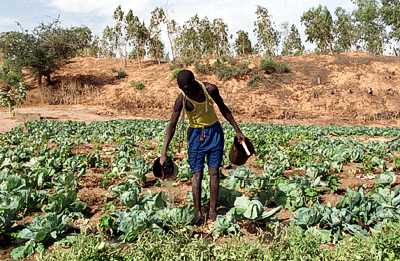 SN49: A farmer in northern Senegal waters his plants, hoping it will help delay the advance of the approaching dunes.