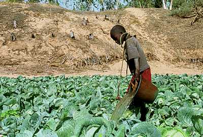 SN50: A farmer in northern Senegal waters his plants, hoping it will help delay the advance of the approaching dunes.