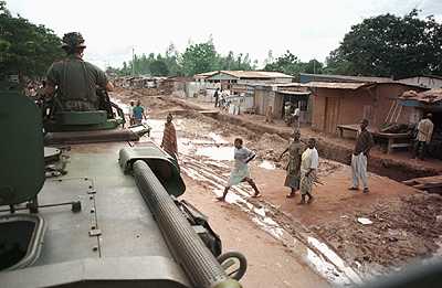 CA05: A French armored personnel carrier rides through the muddy streets of Bangui.