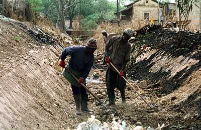 SN62: Sanitation workers help clean up garbage piles in a city in central Senegal.