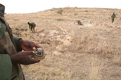 ET02: Specially trained Ethiopian soldiers remove and defuse devices planted in what was once a no-man's land south of the devastated border town, Zala Ambesa.