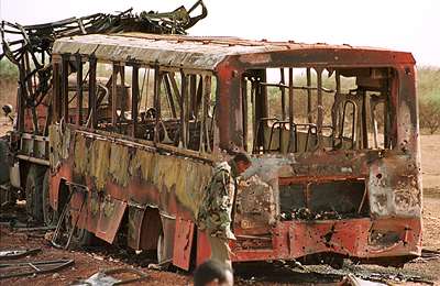 ET10: The burnt-out wreck of a bus along the road leading north to the Eritrean town of Tesseney, presumably the target of an Ethiopian gunship.