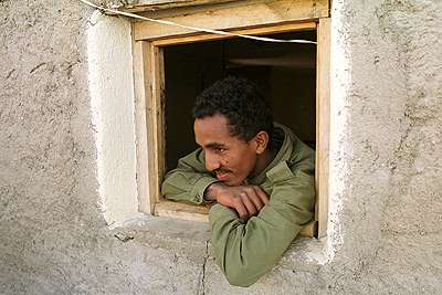 ET17: Near Senafe, a soldier looks out of a window in what had been a strategic command post for the Eritrean army, now taken over by the Ethiopians.