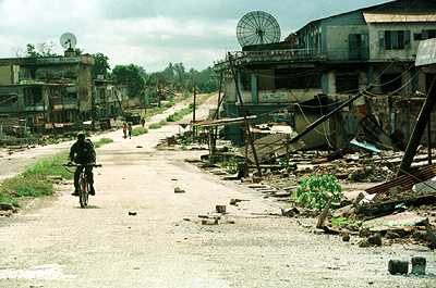 SL23: The main street in the eastern diamond center of Koidu seen days after a RUF rebel attack.