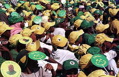 TZ05: CCM pre-election rally. The portrait on the fans is that of President Benjamin Mkapa of the United Republic of Zanzibar. Mkapa was reelected in the polls.