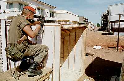 CA04: A French soldier takes up a position on a street in central Bangui.