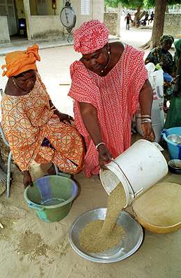 SN25: A woman measures grain to be distributed in a village in northern Senegal.
