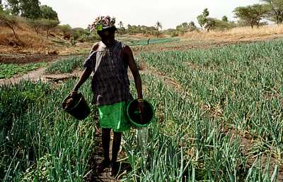 SN51: A farmer in northern Senegal waters her plants, hoping it will help delay the advance of the approaching dunes.