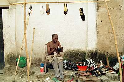 CZ47: A cobbler hangs his work for sale in Kinshasa, Congo.