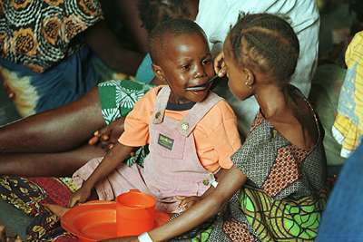 SL10:  A young girl feeds her brother at a feeding center in Kenema, Sierra Leone.