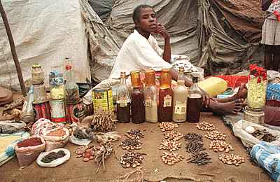 AN01: A vendor of local and traditional medicines at a market in Luanda, Angola.