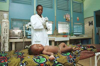BF07: A child waits for medical treatment in a hospital room in Ouagadougou, Burkina Faso.